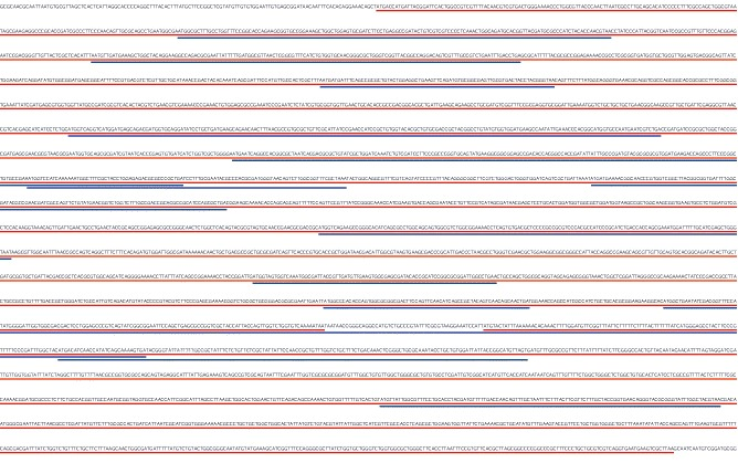 This picture shows a segment of the E. coli genome with all ORFs longer than 50 codons highlighted. The real genes in the sequence cannot be mistaken because they are much longer than 50 codons in length.