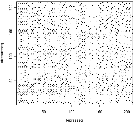dotPlot(dengue, dengue, wsize = 50, nmatch = 50, wstep = 50)