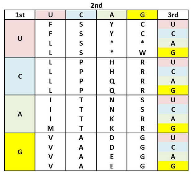Problem 4: Translate the RNA strand into codons using the following table, for each of the three positions. That is, starting at the first base, at the second, and at the third. In order to read the table, you start on the first column, then the first line, then the last column. For example, UUU translates to F.
