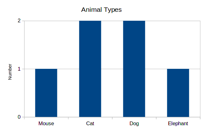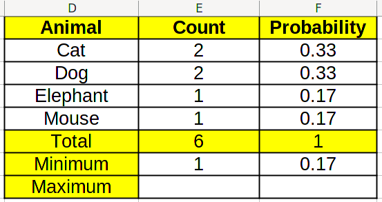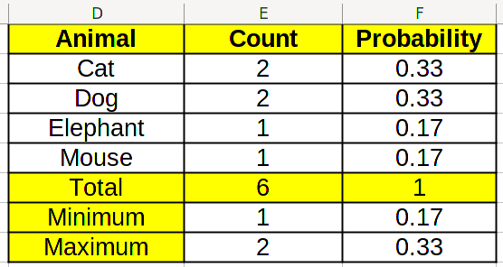 In this case, the smallest count is 1, and the largest count is 2. Therefore, the least probable categories are mouse and elephant, while the most probable ones are cat and dog. This may be very clear in such a small histogram like this one, but may be less evident in a larger one.