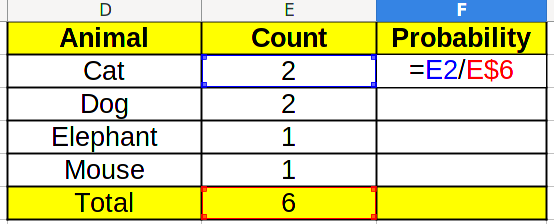Which in this case, will result in 6. Now, to calculate the probability, we need to divide the count by the total. Take a look at the formula below: the E$6 corresponds to the total amount, and we add the $ so that Excel doesn’t change it when we click and drag.
