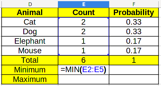 It is interesting to know what are the least and most common categories in the data set. To calculate the minimum, we use the MIN/МИН function on the data range: