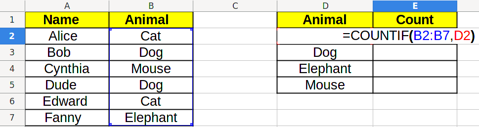 Now, we would like to use Excel click and drag function to fill the whole table. However, if we do that now, and go to the next cell, we will see =COUNTIF(B3:B8,D3), which is not what we want! We want =COUNTIF(B2:B7,D3), because that is the actual range of data.