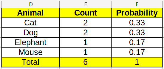 This same data can be represented differently. Instead of writing the total numbers for each of the categories, we write the proportions for each one of these. Or equivalently, the probability of a data point being in each category. So, for example, we have 2 cats among 6 animals, so the probability is 2/6 = 0.33. We can rewrite the table as: